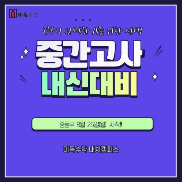 안녕하세요. 미독수학입니다. 여름방학. 우리 아이의 학습 레벨을 상승시킬 수 있는 가장 중요한 시간입니다!! 미독에서 여름방학 보내기!! 여름방학은 미독에서 수학에 올인하세요. ●공통수학1, 2 학습에 완벽함을 더해줄 문제풀이 강좌 ●2학기 내신대비 A를 위한 기출특강 ●나만의 시간표로 매일매일 공부 할 수 있는 개별맞춤강좌 2025 여름방학은 미독에서 살