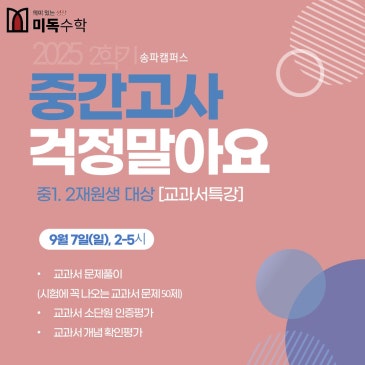 안녕하세요. 미독수학 송파캠퍼스입니다. 미독 중1, 2 재원생들의 중간고사 고득점 확보를 위한 [교과서 특강]을 준비했습니다. ◆ 수업일 : 9/7/일, 오후 2시-5시 ◆ 수업자료 - 본인학교 수학교과서 (꼭 챙겨오세요!!) - 추가 프린트 (시험에 꼭 나오는 교과서 문제 50제) ◆ 특강 수업 구성 1)교과서 문제풀이 2)교과서 소단원 인증평가 3)교과