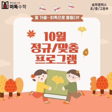 안녕하세요. 미독수학 송파캠퍼스입니다. 10월 정규/맞춤 프로그램입니다. 개별맞춤반은 수업 정원이 정해져 있습니다. 현재 마감된 반이 많으니 상담실(416-4050)에서 현재 수업 가능한 요일과 시간을 확인해주세요!! ● 개별맞춤반수업 커리큘럼 예시