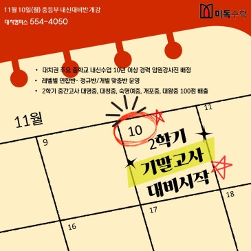 안녕하세요. 미독 대치캠퍼스입니다. 중등부 2학기 중간고사 내신대비 시간표 안내드립니다.