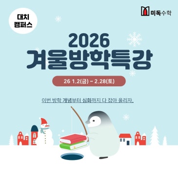 2026년의 시작 중요한 첫걸음을 미독수학에서!! 미독수학 2026 겨울특강 프로그램 안내입니다. 우리의 겨울방학은 완벽해야합니다. 지금 나에게 필요한 과정은 무엇인지 정확하게 판단하고, 올 겨울 수학실력을 확실하게 레벨업 할 수 있도록 해야합니다. 미독수학의 2026 겨울특강으로 새학년 새학기를 자신감 있게 시작하세요!!!