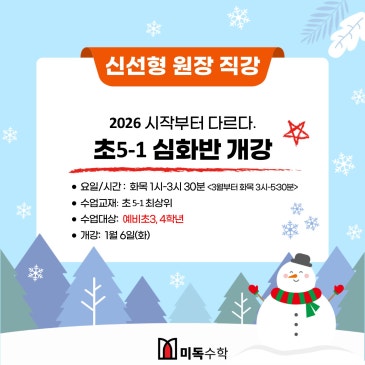 미독수학입니다. 2026년 1월 예비초3,4 대상 초 5-1 심화 정규반을 개강합니다.