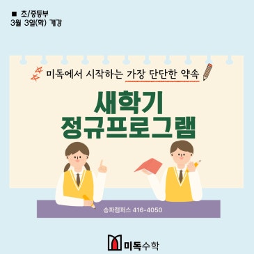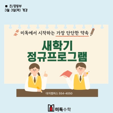 미독수학입니다. 3월 새학기 정규프로그램입니다. 2026 새학기 미독에서 시작하는 가장 단단한 약속 뚜렷한 목표를 세우는 것!! 내가 이해한 개념 하나를 소중히 여기는 것!! 어제의 나보다 성장하는 공부를 하는 것!! 미독수학은 개념을 정확히 이해하는 수업 학생별 수준에 맞춘 학생 밀착형 수업에 집중합니다.